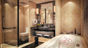 3d rendering modern and classic loft bathroom with luxury tile decor