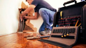 Middle aged man repairing burst pipe,plumbing, focus on foreground