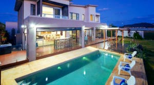 Modern multilevel house exterior with pool