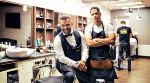 Two male haidressers and hairstylists sitting in barber shop.