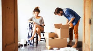 Young couple moving in new house, unpacking things.