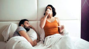 Young Woman Sneezing For Cold In Bed With Man